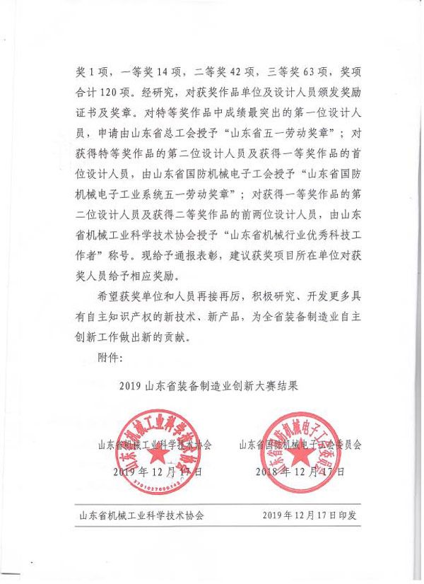 公司榮獲山東省裝備制造業(yè)創(chuàng)新大賽二等獎(jiǎng)